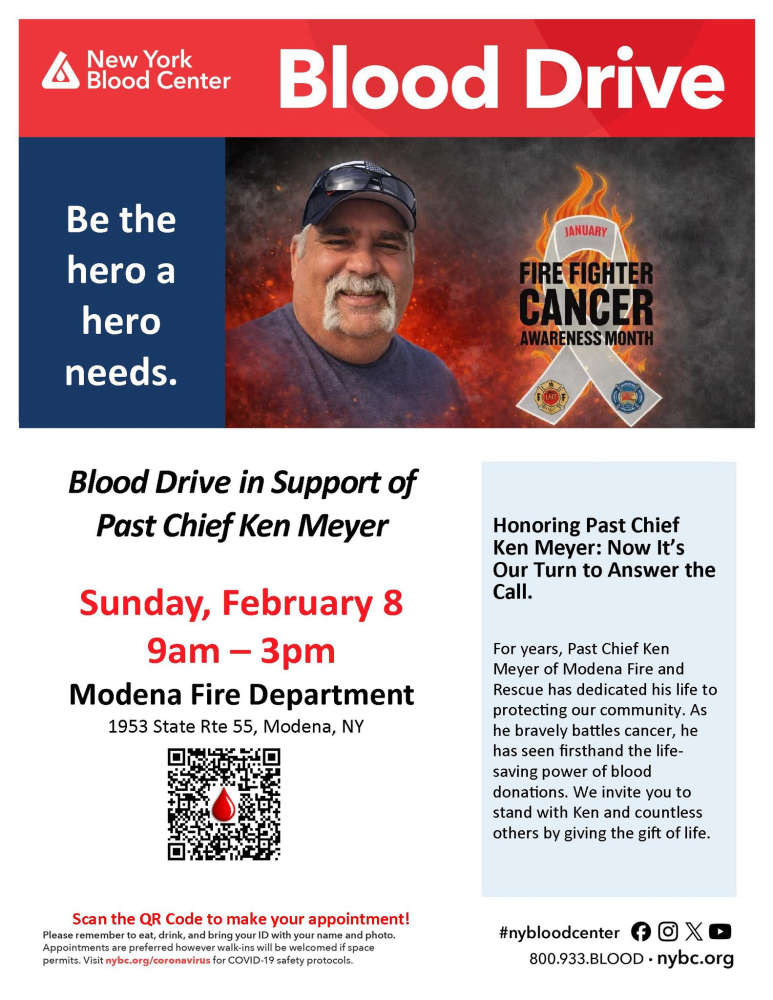 Modena Fire Department Blood DriveJoin the Modena Fire Department for their Blood Drive honoring Past Chief Ken Meyer.