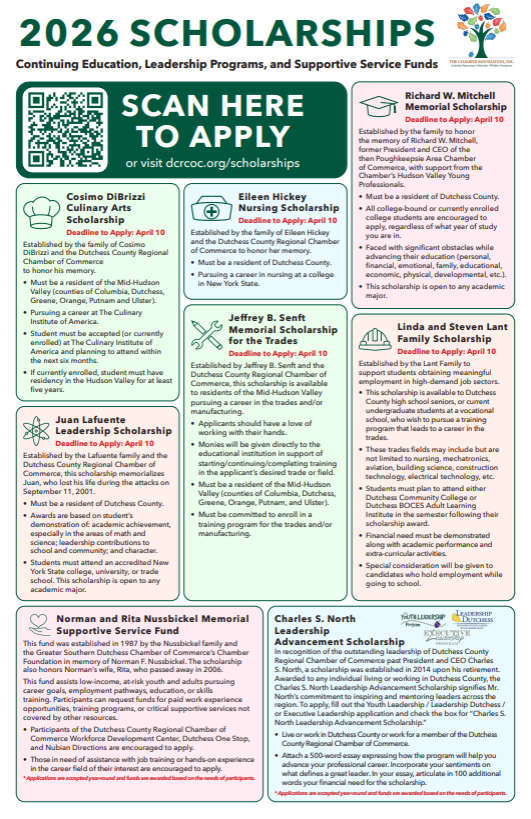 Dutchess Chamber Foundation Scholarship OpportunitiesScholarships are available for continuing education, leadership programs and supportive service funds.