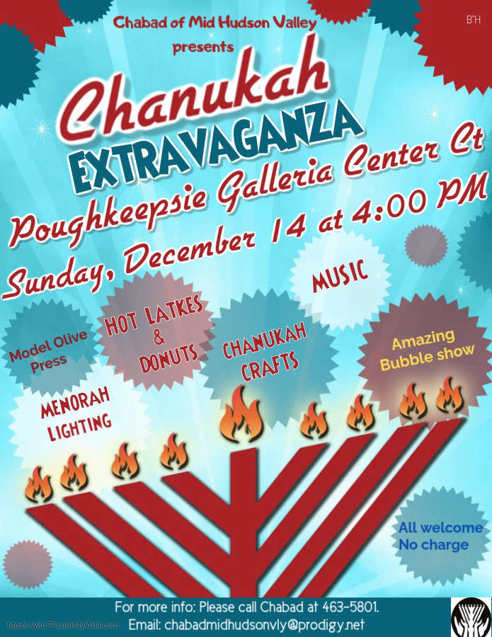Chanukah ExtravaganzaChabad of Mid-Hudson Valley hosts their Chanukah Extravaganza, Center Court of the Poughkeepsie Galleria.