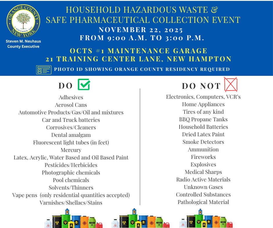 2025 Hazardous Waste and Safe Scripts Collection EventsOrange County will host the sixth and final set of 2025 Hazardous Waste and Safe Scripts Collection Events at Orange County Transfer Station #1 Maintenance Gara...