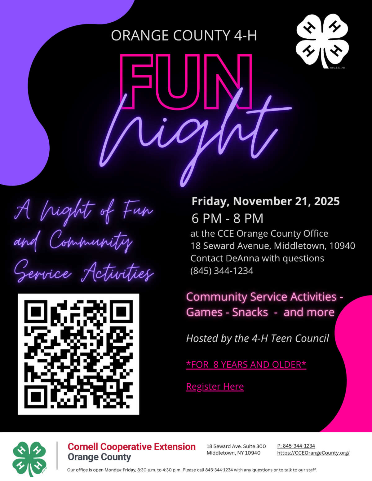 Orange County 4-H Fun NightCornell Cooperative Extension of Orange County hosts their 4-H Fun Night for activities, games and more 8 years of age and older!