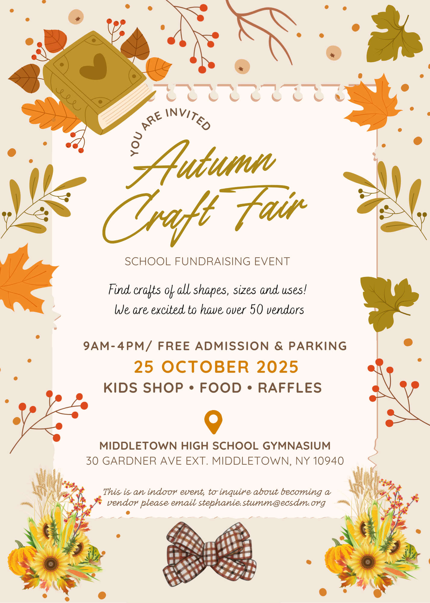 Event: Autumn Craft Fair Supporting: Middletown City Schools Athletic Programs (This is a school fundraising event!) Date: Saturday, October 25, 2025 Time: 9:00 AM - 4:00 PM Location: Middletown High School Gymnasium, 30 Gardner Ave Ext, Middletown, NY 10940 Admission: FREE Parking: FREE Highlights: